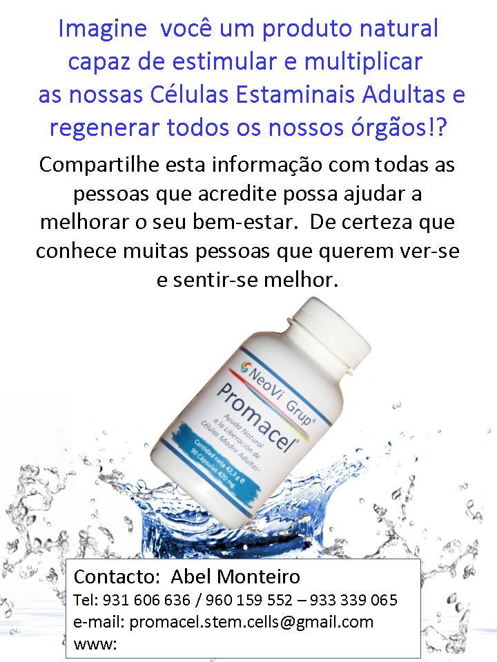 O que éPromacel®?"Quanto maior for a quantidade de célulasestaminais a circular, maior é a capacidade do corpopara se recuperar" - New England Journal of Medicine-Promacel® é um estimulador e multiplicador de células estaminais adultas.Promacel é o resultado de uma mistura de substâncias naturais, um produto demarca registada, criado a base de nutrientes botânicos, que nos ajuda a fortalecero sistema imunitário e a lutar contra os radicais livres. Segundo estudoscientíficos pesquisados, a sua componente base (Aphanizomenon flos aquae),promove a proliferação de células estaminais adultas.
